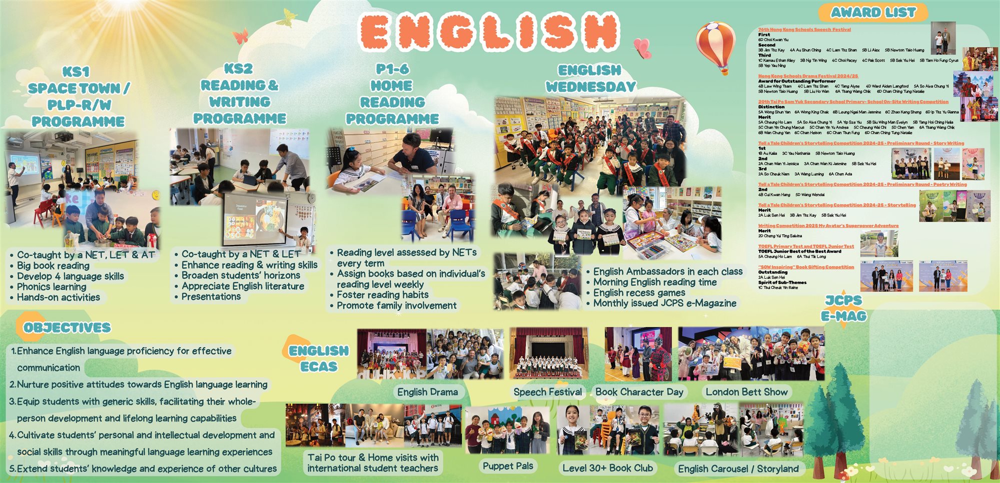 Our school-based programme for P4–6 features selected readers and supplementary reading materials that align with the General English (GE) syllabus. NETs and local English teachers co-teach each lesson, explicitly targeting the development of students’ reading and writing skills. Additionally, this programme aims to broaden students’ horizons and nurture their appreciation for the beauty of English literature.