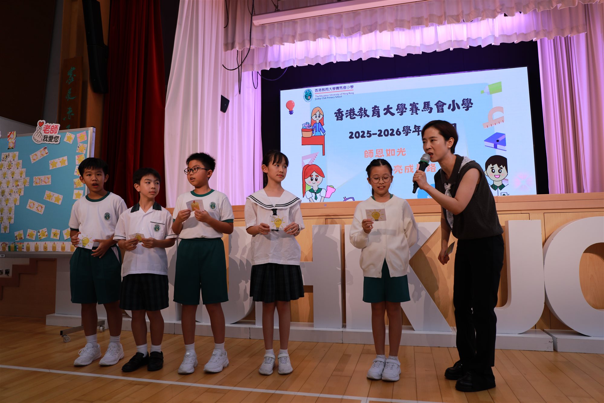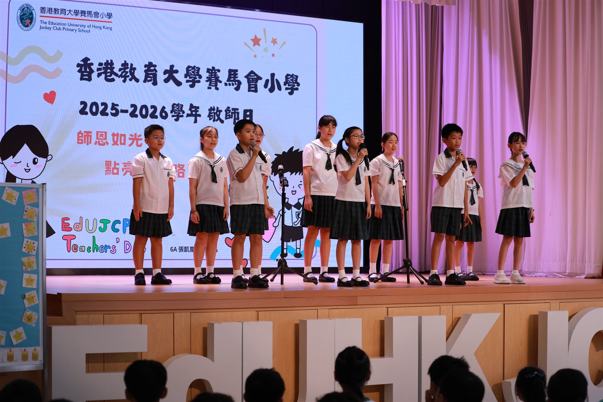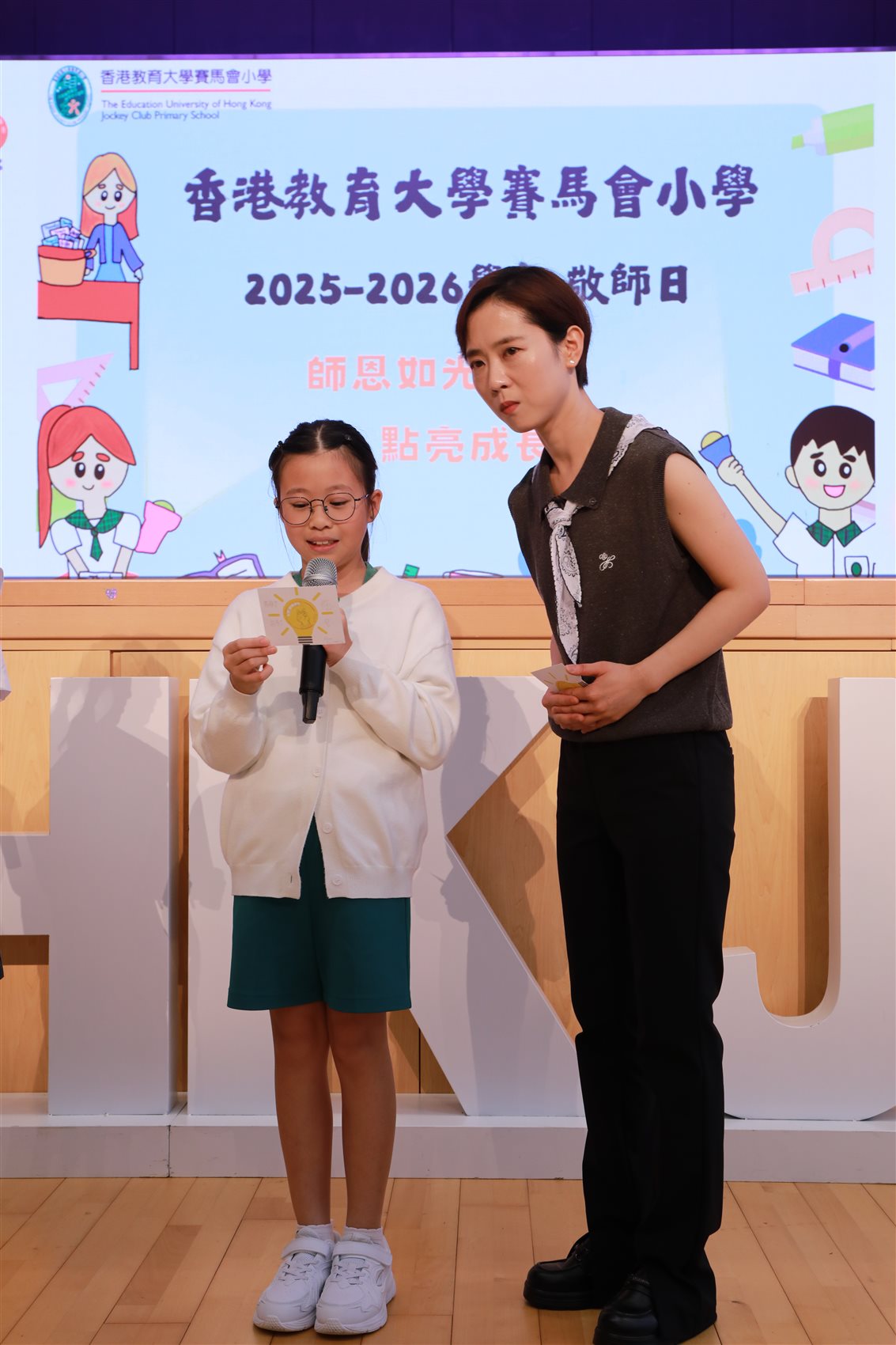 活動由學生代表合唱《追光者》揭開序幕,歌聲真摯動人,表達對老師們的尊敬及謝意。隨後學生們在「敬師感言分享」環節中,朗讀親手撰寫的敬師卡,學生代表亦向老師們獻上感謝狀,傳達感恩之情。同時,家長教師會精心準備禮物與果籃,經學生代表轉贈予老師,傳遞了全體家長對教師的敬意。