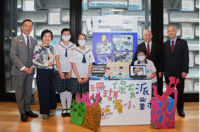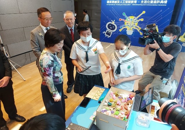 學生們向來賓介紹編程作品—健康珊瑚色卡配對系統,學生以App Inventor編程,結合由澳洲昆士蘭大學研發的珊瑚健康色卡,以人工智能監測珊瑚健康,提升人們的保育意識,將運算思維教育課程內容學以致用,回饋社會。