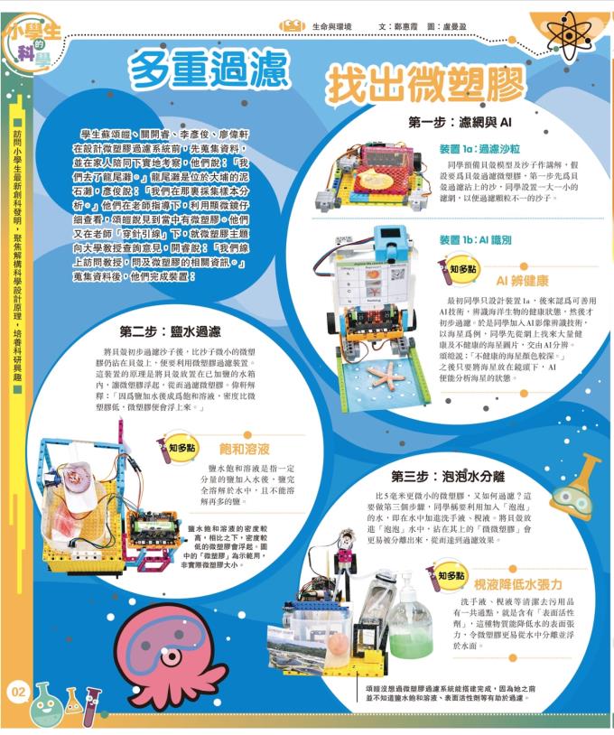 訪問中學生分享了如何透過實驗了解微塑膠對海洋環境及海洋生態系統的威脅後,運用已有的編程及人工智能知識設計機械人,將過濾微塑膠過程自動化。2025年1 月學生將作品帶「英國教育科技博覽會」(Bett Show)展出,至6月將作品投稿參與「學生創新大賽2025」賽,取得小學組亞軍殊榮。