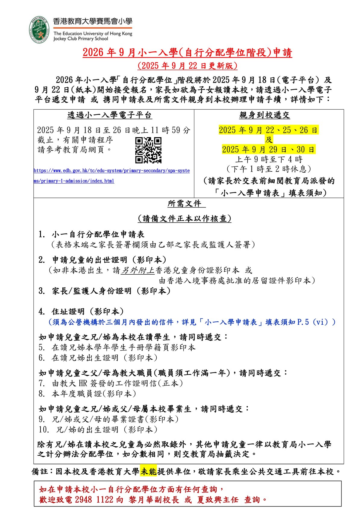 2026年9月小一入學(自行分配學位階段)申請(更新版)
