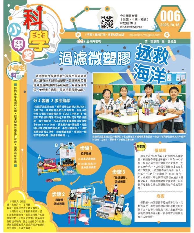 訪問中學生分享了如何透過實驗了解微塑膠對海洋環境及海洋生態系統的威脅後,運用已有的編程及人工智能知識設計機械人,將過濾微塑膠過程自動化。2025年1 月學生將作品帶「英國教育科技博覽會」(Bett Show)展出,至6月將作品投稿參與「學生創新大賽2025」賽,取得小學組亞軍殊榮。